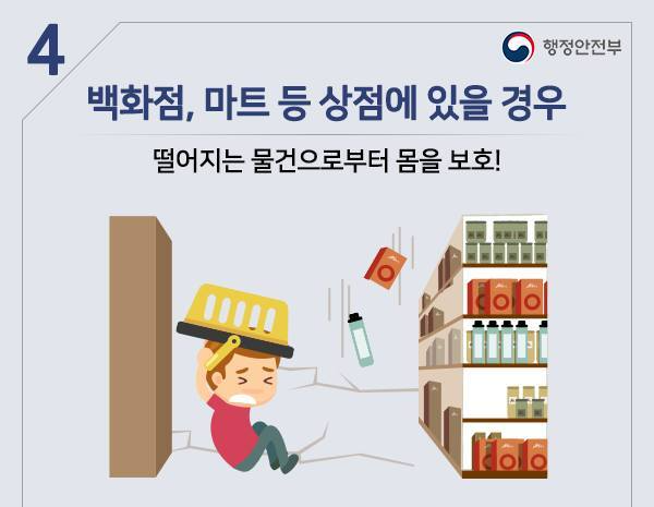 진열장에서 떨어지는 물건으로부터 몸을 보호한 후 흔들림이 멈추면 밖으로 대피합니다.
