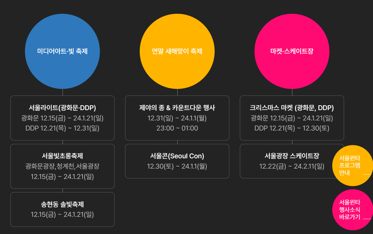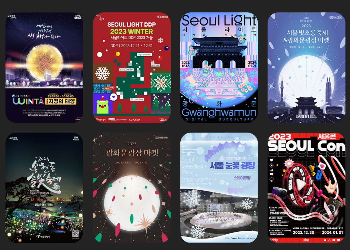 “세상에 없던 빛, 서울을 물들인다” 란 모토로 서울 도심 7개 공간에 펼쳐지는 10개 축제를 ‘빛’으로 이은 초대형 메가페스타 입니다. 미디어 파사드 전시·빛 조형물 전시·크리스마스 마켓·스케이트장·연말 카운트다운 행사 등을 포함한 겨울 축제입니다.