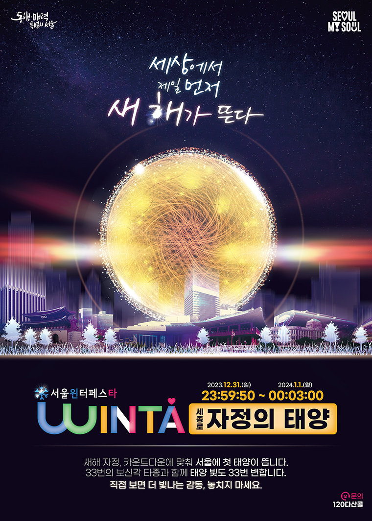▶ 행사내용: 2024년 0시 ‘자정의 태양’이 떠올라 2024년 새해를 밝힌 후, 세종대로 카운트다운 무대에서 본격적인 새해 축하 공연이 시작됨.