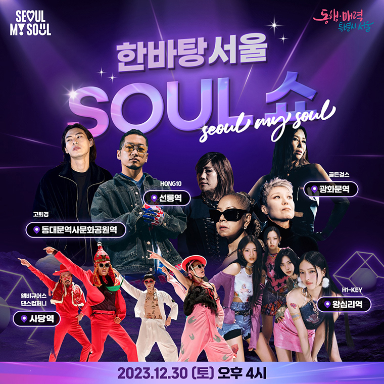 ▶행사취지 : 서울시가 시민들을 격려하기 위해 마련한 연말 이벤트로 따로 공연장을 찾지 않고 가까운 지하철 역사안에서 연말 분위기를 함께 즐기기 위한 게릴라 콘서트 "한바탕 서울 SOUL 쇼"