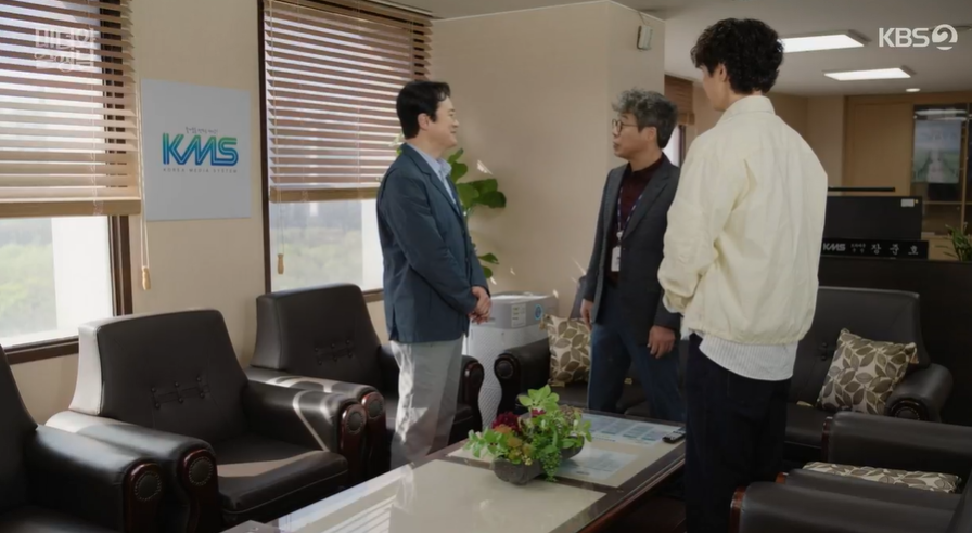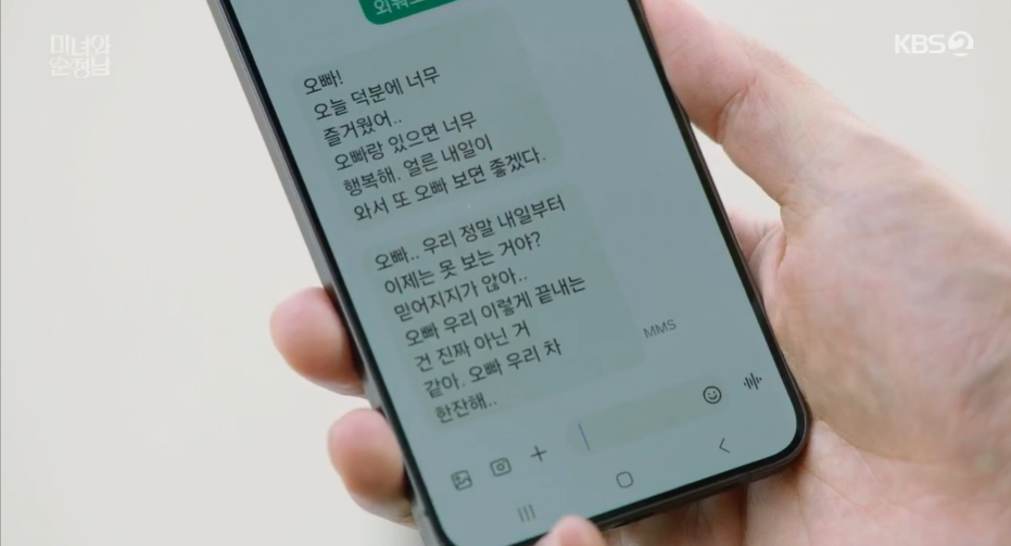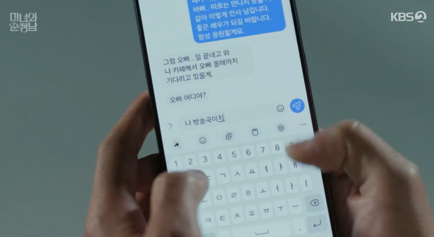 그때 계속 기다리가가 영업이 끝나다는 직원때문에 나갔던 도라가 필승에게 문자를 보내고 , 필승은 방송국이라며 거짓말로 답장을 합니다.