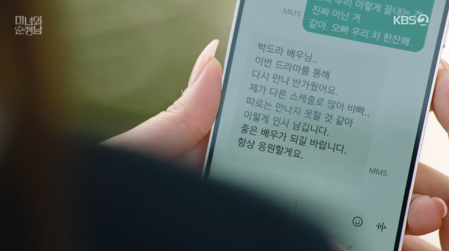 결국 그렇게 마지막 촬영을 마친 도라는 미련이 남아 필승에게 문자를 보내지면, 필승은 도라를 박배우님이라고 부르며 이렇게 끝날 수 없다는 도라에게 거절의사를 밝힙니다.