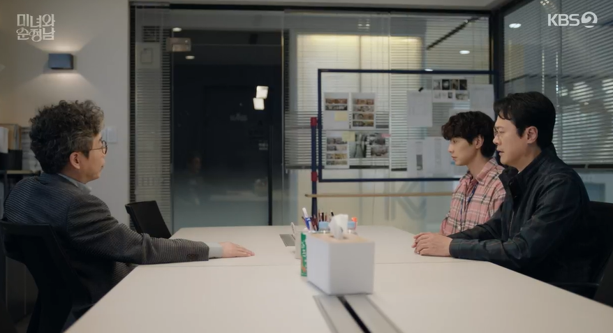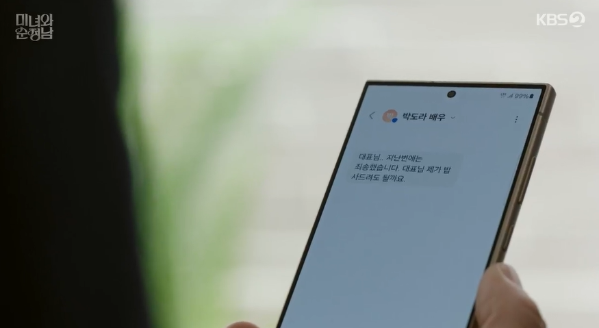 전날 도라때문에 만취했다가 회사에서 잠이깬 필승은 홍감독을 통해서 도라의 스폰 기사에 나왔던 중년남자가 재현배우 같다며 이야기를 해주고, 도라에게 연락이 안된다고 말해줍니다.