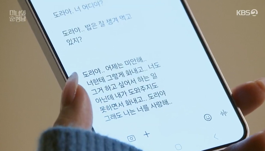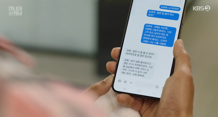 다음날 아침 잠이 깬 필승은 속상한 마음에 눈물을 흘리고, 도라에게 사과 문자를 보냅니다.