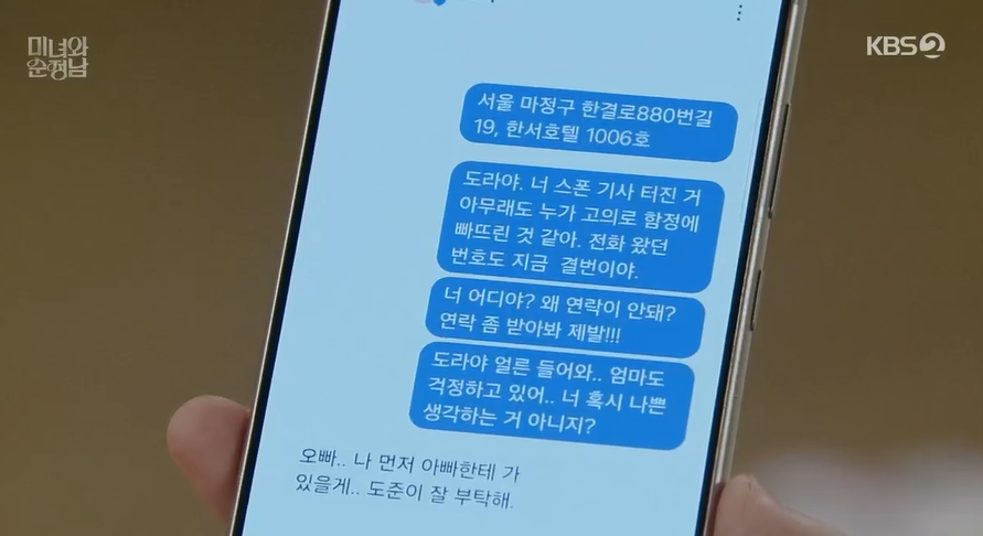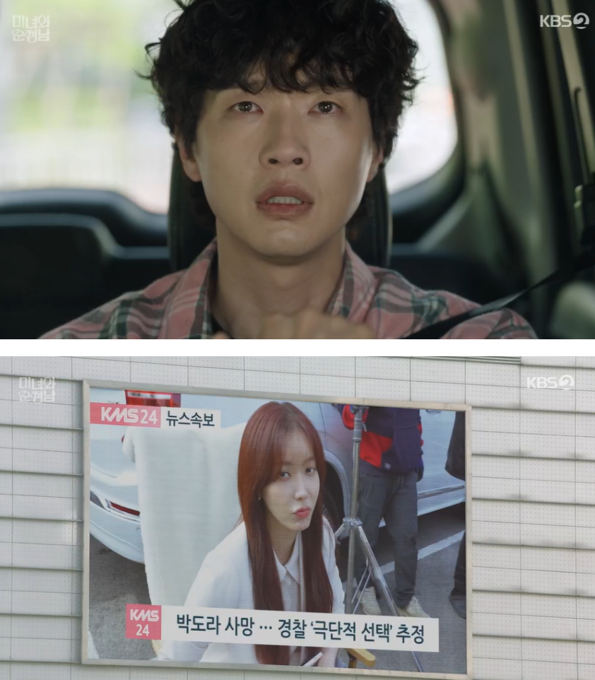 뒤늦게 전날 도라가 자신에게 행복하라며 남긴 마지막 문자를 본 필승은 아차하는 마음에 도라를 수소문하면서 찾아다니다가 도라가 죽었다는 사망속보를 접하게 됩니다.