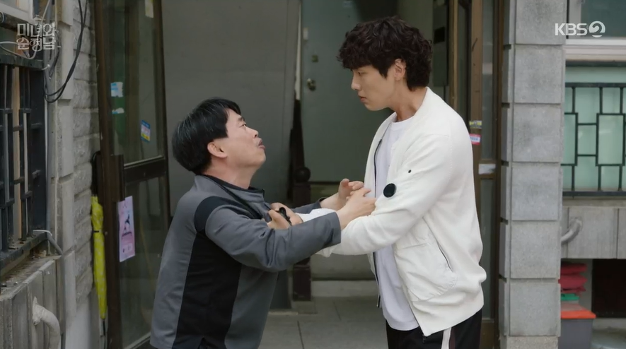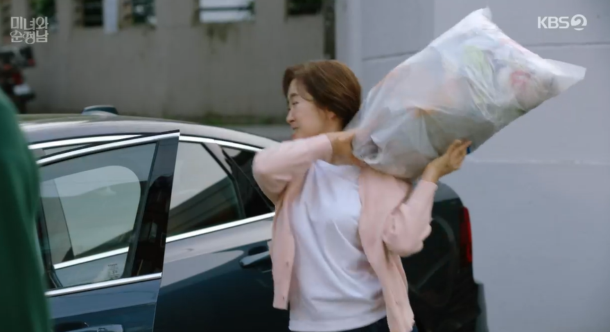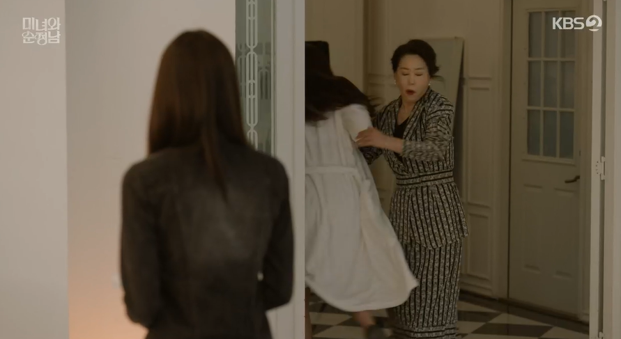 미자는 필승의 집앞에서 기다리고 있다가 실연 후 넋이 나간듯 집으로 오는 필승에게 도라와 사겼던 일을 퍼드리지 말라고 막말을 합니다. 아무말 못하고 듣고 있는 필승의 모습을 마침 선영이 쓰레기를 버리려다가 보고 미자의 뺩을 때리고 쓰레기 봉투를 휘둘러 미자를 쫒아냅니다.
