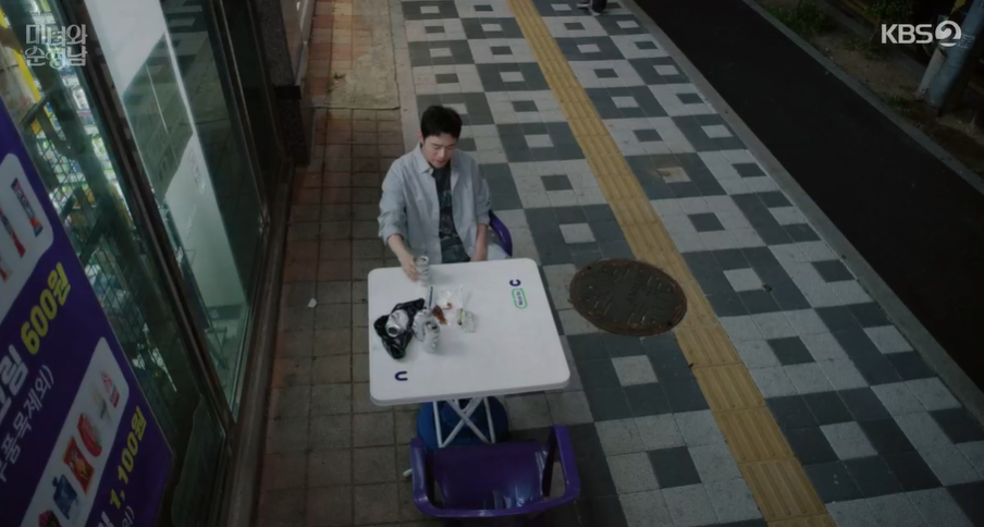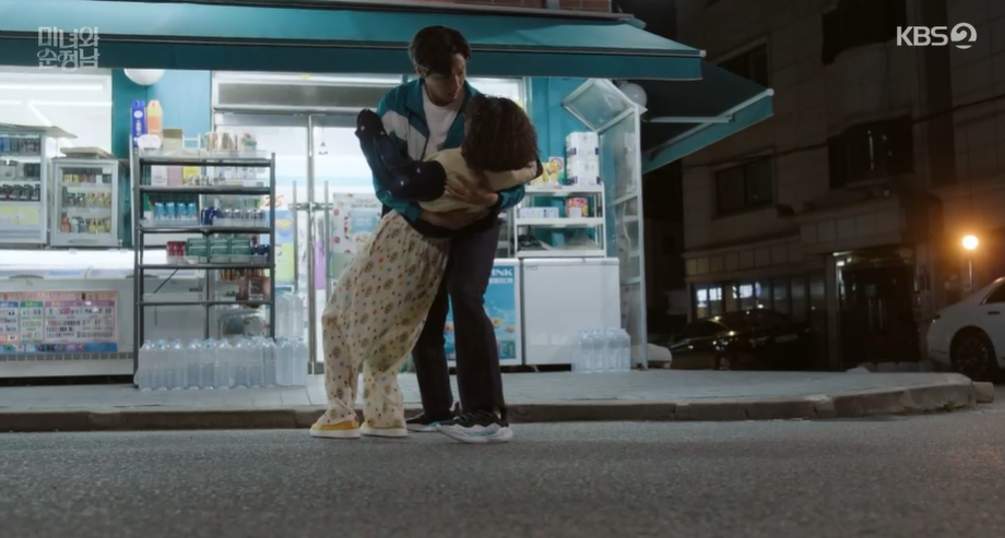 밤에 군것질 거리를 사러 편의점에 갔다가 지영은 운동을 하는 필승을 보고 놀라고 필승은 넘어질뻔한 지영을 도와줍니다