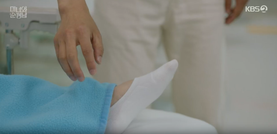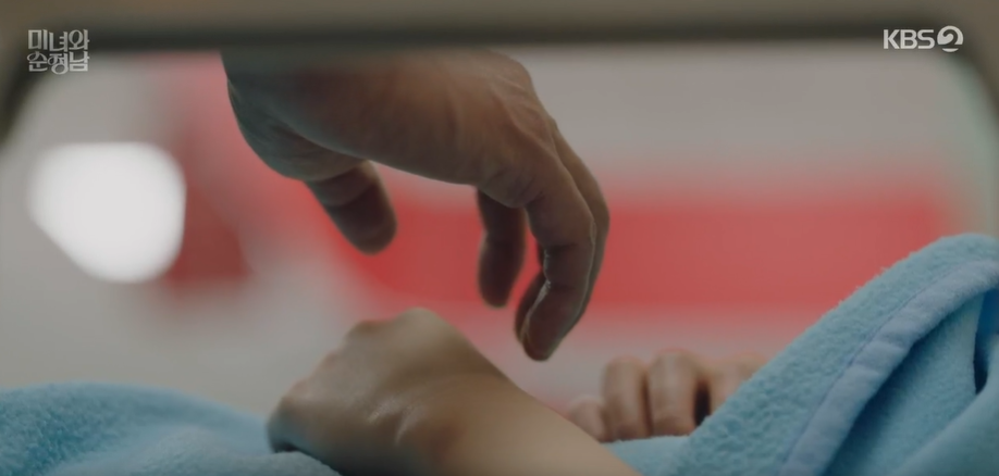 지영만 보면 마음이 이상해진 필승은 무심결에 손을 잡으려다가 당황해서 응급실을 뛰쳐나갑니다.