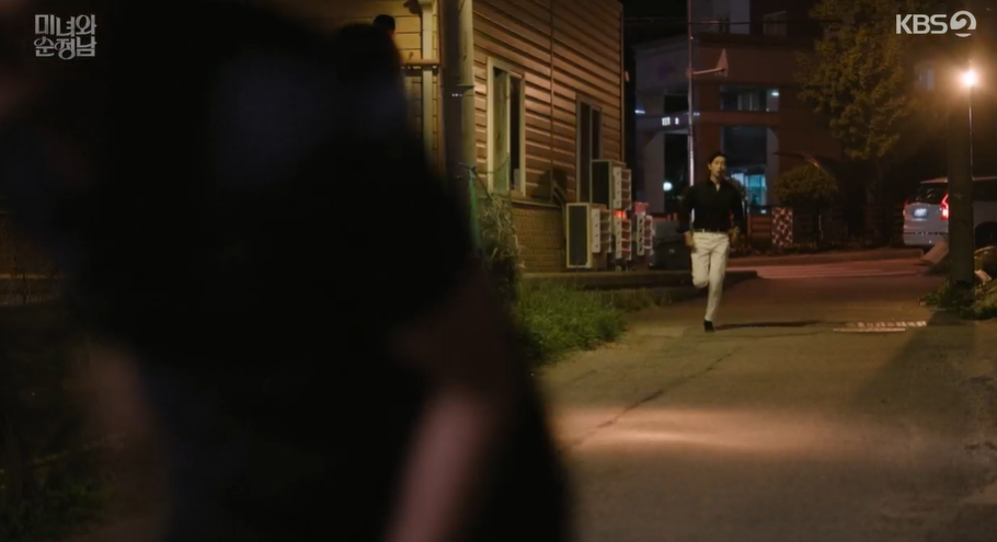필승의 차에서 내려 집으로 향하던 지영에게 낯선 남자가 자신과 사귀자고 하며 지영과 실랑이를 하게 되고 마침 지영이 핸드폰을 두고 내려서 전해주려고 필승이 왔다가 그 모습을 보고 도와줍니다.
