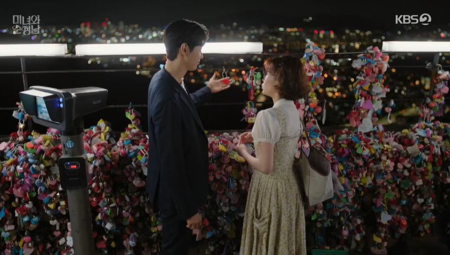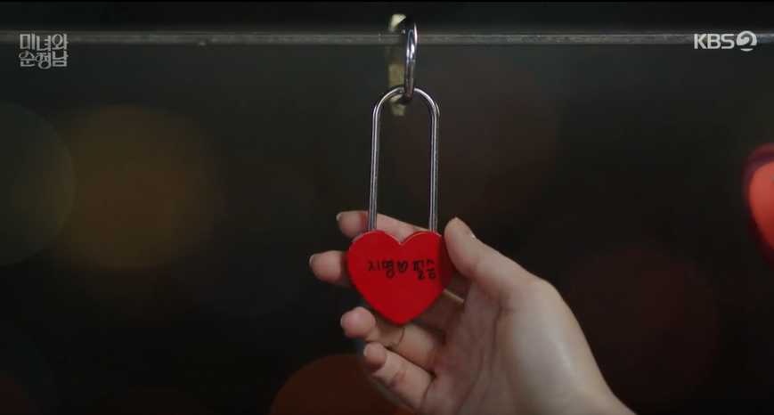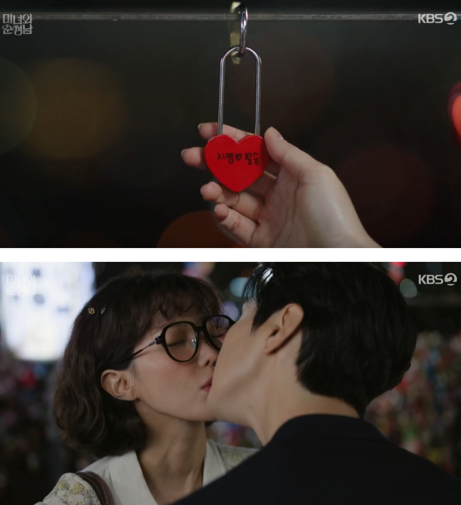 지영이 바라던대로 남산에 가서 사랑을 약속하는 자물쇠를 채운 두사람은 앞으로도 절대 변하기 없기로 약속을 하고는 키스를 합니다.