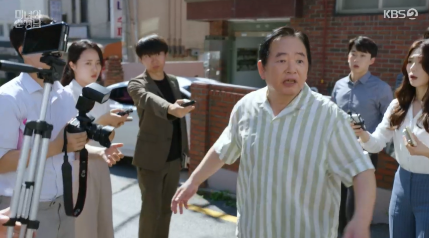 집으로 돌아온 상구는 집앞에서 필승을 기다리던 기자들에게 필승네 집에 드나드는 여자가 많았다며, 필승이 여자관계 복잡했던 것처럼 인터뷰를 합니다.