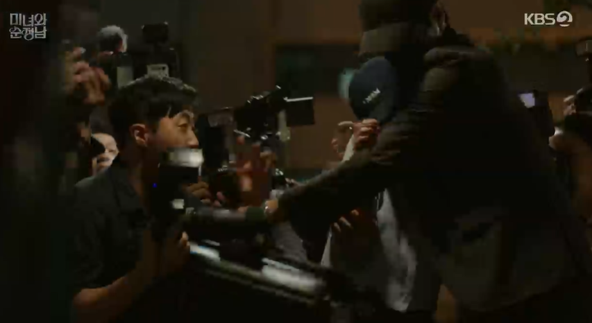 뒤늦게 기자회견장을 찾은 필승은 계란과 밀가루 세례를 받고 있는 도라를 보호해주고 두사람은 겨우 기자회견장을 빠져나옵니다.