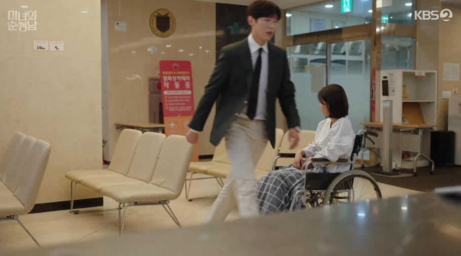 필승이 가버리자 울먹이며 혼자 휠체어를 가는 도라.. 하지만 금새 필승이 돌아와 말없이 도라의 휠체어를 밀어줍니다.