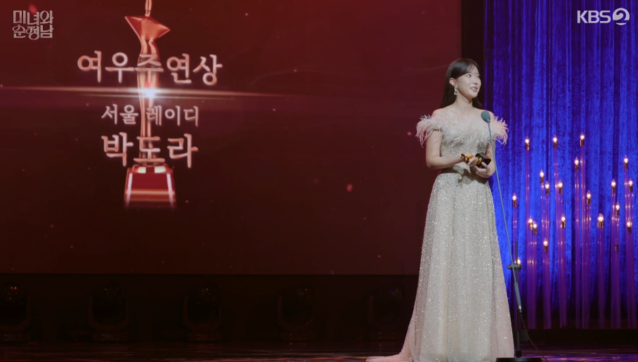 황룡영화제 여우주연상으로 수상을 하게된 도라는 많은 사람들의 박수를 받으면 상을 받으러 나가서 감동적인 수상소감으로 고필승 감독에게 감사인사를 전합니다.